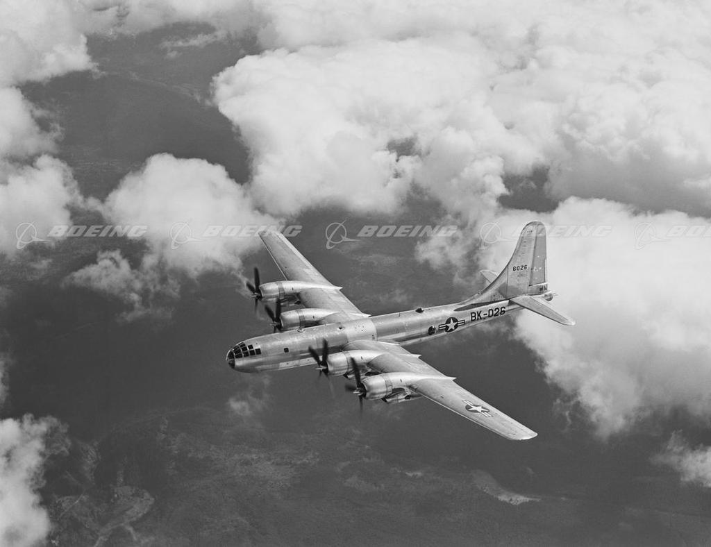 The four-engine, propeller-powered B-50 bomber, which first flew in 1947, was among the last piston-powered bombers built during an era that was to be dominated by jets. However, in 1949, the B-50A, the Lucky Lady II, made the first nonstop flight around the world in 94 hours, refueled in flight four times by KB-29Ms. The B-50 originally evolved from the B-29D but because it included so many improvements, it was redesignated the B-50A, with 59 percent more power than the B-29. The next version, the B-50B, fitted with cameras and wing tanks, was designated RB-50B and used for strategic reconnaissance. The B-50D, the most common variant, was distinguished by a one-piece transparent-plastic nose molding and an optically flat bombardier’s window in the lower portion. Some B50s were later converted to hose-type KB-50 aerial tankers, their speed enhanced by the addition of two 5,200-pound-thrust jet engines, so at 400 mph, they could refuel jet aircraft. One KB-50D became a drone to test Bell XGAM missiles and 36 became long-range reconnaissance aircraft (WB-50D).