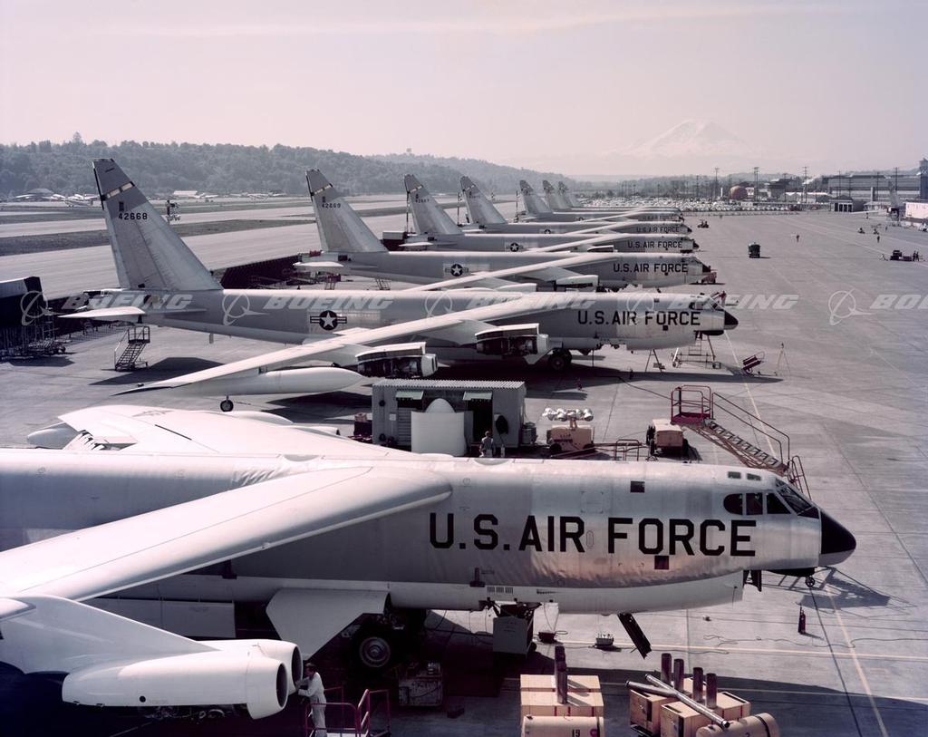B-52C Stratofortresses on flight apron at Boeing Field, Seattle, being prepared for first flight. From here they will be flown to the Boeing Flight Center at Larson AFB, Moses Lake, WA, where they will be flight tested prior to delivery to the U.S. Air Force.