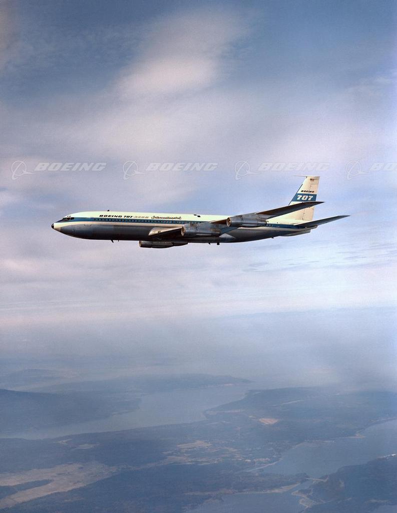After the Air Force agreed to let Boeing build commercial jets based on the prototype, 367-80, already the basis for the KC-135 military tanker, airlines began to order the 707, the commercial transport variant of the Dash 80. The 707 and the KC-135 had many features in common. Both were visually distinct, with a stinger antenna pointing forward from the top of their vertical fin. The 707's width and 100-foot length made it the largest passenger cabin in the air at the time. Placement of its more than 100 windows allowed airlines to rearrange seats. Location of passenger doors on the left side, at the front and at the rear of the cabin, became standard for subsequent Boeing jets. The exteriors of the 707 and its competitor, the DC-8, were almost identical, but the 707 wing had more sweepback, so it could fly about 20 mph faster.
