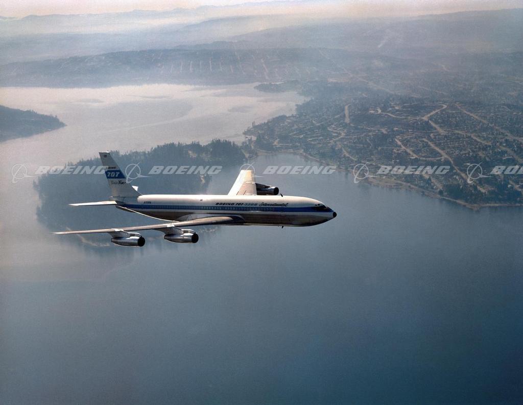 After the Air Force agreed to let Boeing build commercial jets based on the prototype, 367-80, already the basis for the KC-135 military tanker, airlines began to order the 707, the commercial transport variant of the Dash 80. The 707 and the KC-135 had many features in common. Both were visually distinct, with a stinger antenna pointing forward from the top of their vertical fin. The 707's width and 100-foot length made it the largest passenger cabin in the air at the time. Placement of its more than 100 windows allowed airlines to rearrange seats. Location of passenger doors on the left side, at the front and at the rear of the cabin, became standard for subsequent Boeing jets. The exteriors of the 707 and its competitor, the DC-8, were almost identical, but the 707 wing had more sweepback, so it could fly about 20 mph faster.