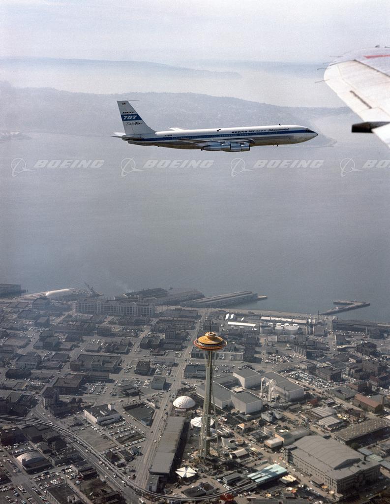 After the Air Force agreed to let Boeing build commercial jets based on the prototype, 367-80, already the basis for the KC-135 military tanker, airlines began to order the 707, the commercial transport variant of the Dash 80. The 707 and the KC-135 had many features in common. Both were visually distinct, with a stinger antenna pointing forward from the top of their vertical fin. The 707's width and 100-foot length made it the largest passenger cabin in the air at the time. Placement of its more than 100 windows allowed airlines to rearrange seats. Location of passenger doors on the left side, at the front and at the rear of the cabin, became standard for subsequent Boeing jets. The exteriors of the 707 and its competitor, the DC-8, were almost identical, but the 707 wing had more sweepback, so it could fly about 20 mph faster.