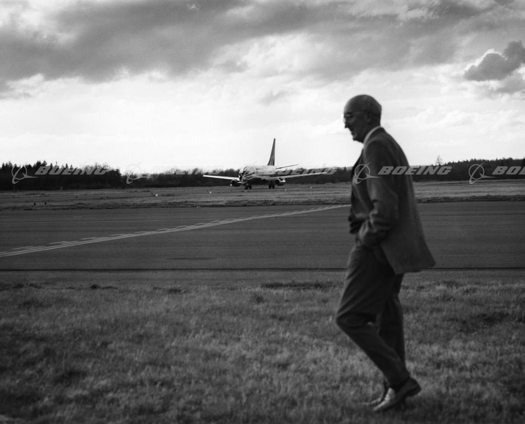 Boeing CEO William Allen greets the number one 737 at Paine Filed Everett, WA as it completes its first flight on April 9, 1967.