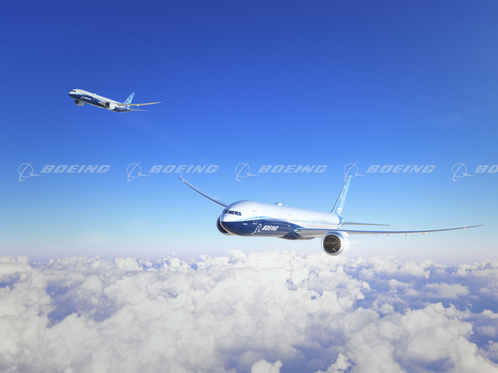 777-9; 2018 BCA Unified Family livery; air to air; viewed from below; left front views; full body views; blue skies; clouds; day; blue; computer-generated imagery (CGI); 787-9 Dreamliner