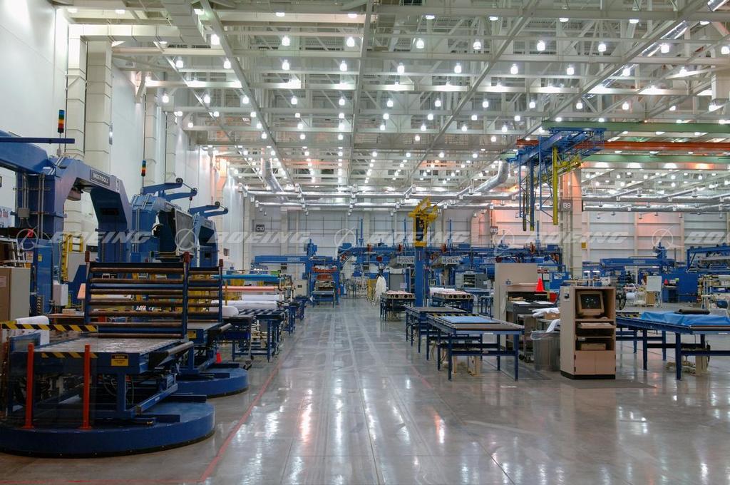 A large interior space is designed for efficiency in composites manufacturing process flow at the Boeing facility in Frederickson, Washington.