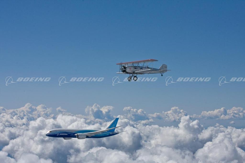 Boeing Model 40 Serial number 1043 is the oldest flying Boeing aircraft of any kind. Boeing 787 ZA001 is the first Dreamliner. History was made when these two aircraft flew together on May 8, 2010 near Seattle, WA. The Model 40 was restored over an 8 year period and returned to the skies in February 2008.