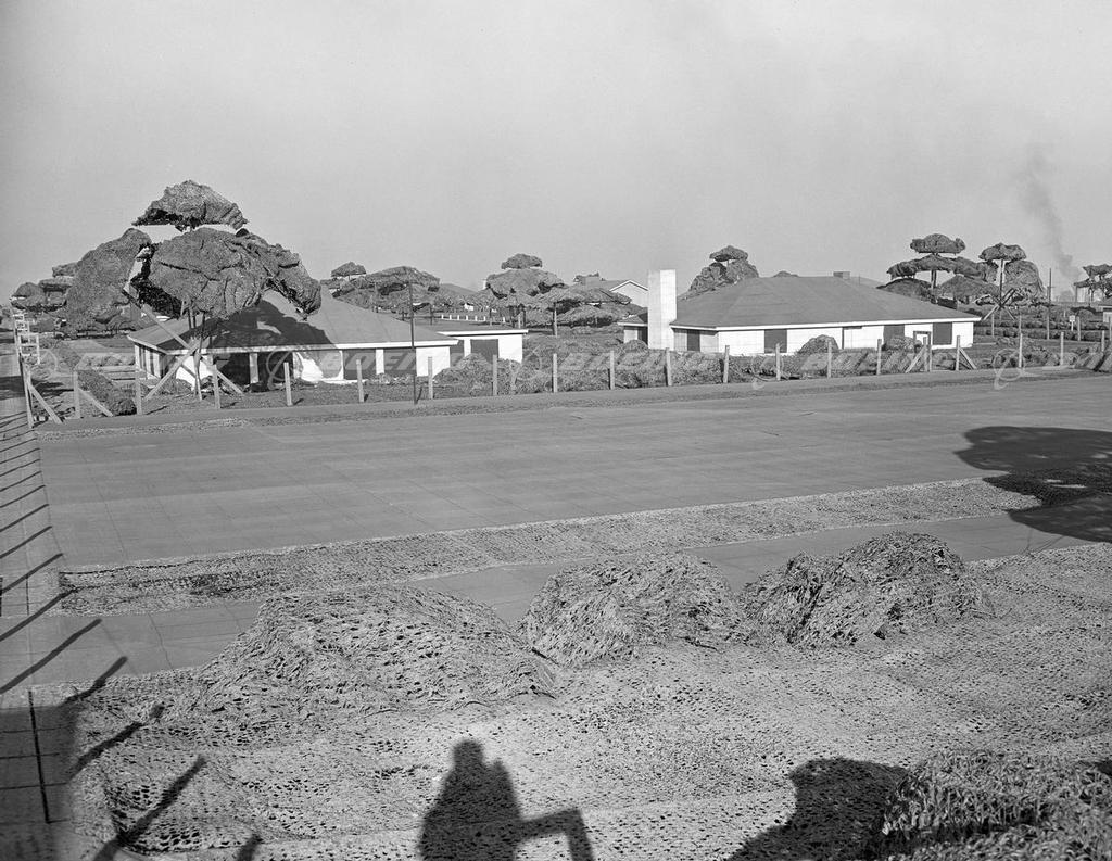 Camouflage installations and materials on Boeing Field and Plant II during WWII included bomb shelters, machine gun platforms, troop dormitories, a casualty station and a message center. The most elaborate camouflage construction was the 26-acre illusory residential Wonderland atop the Plant II factory building shown here. Made of chicken-feather trees, painted canvas buildings, green burlap lawns landscaped with shrubs of spun glass on wire, the "village" had 53 residences, 24 garages, a corner service station, a neighborhood store and three green houses. The wartime cover for the plant extended over neighboring Boeing Field. The camouflage over Boeing Field sported the look of a more sparsely settled community. In 1946 the camouflage structures were dismantled by Army engineers.