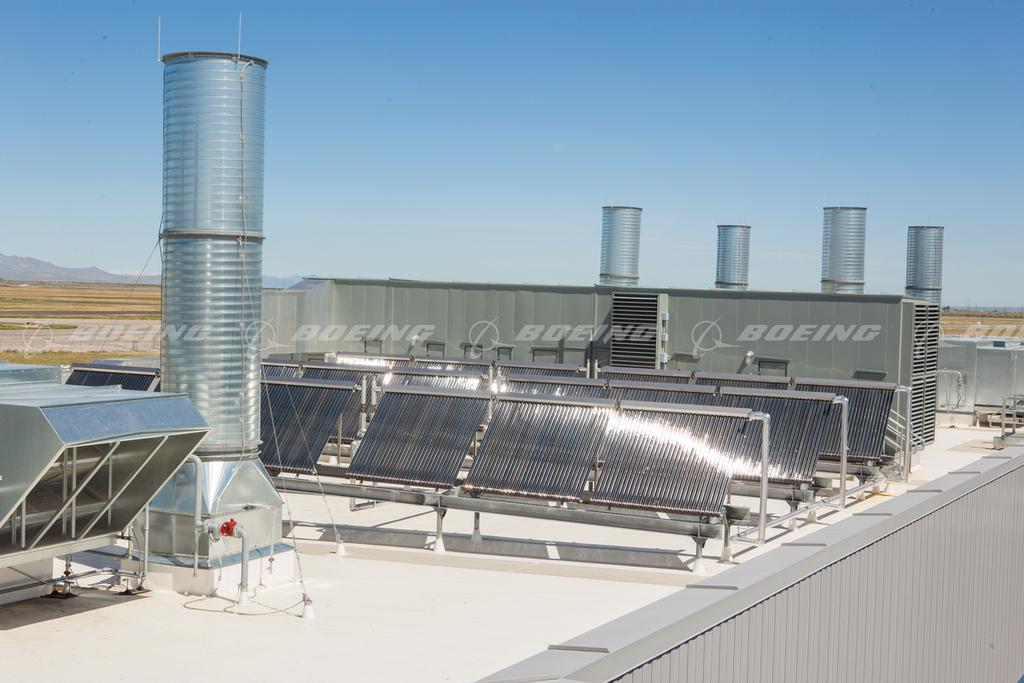 To receive the LEED Silver certification, the building was designed to include numerous large windows, which are not commonly used in paint facilities; a rainwater collection system; recycled and salvaged building materials and enhanced environmental controls. But what makes the building stand out are the 3,600 rooftop solar tubes that provide heating for a portion of the paint operations. This addition also makes it the first Boeing paint facility to be partially heated by solar energy. Located on the roof of the building, thousands of solar tubes collect energy from the sun, which is used to heat water that is piped to the curing process.