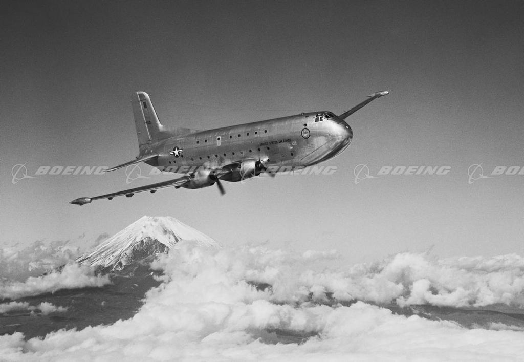 Douglas C-124 Globemaster II (1949-1955): The C-124 Globemaster II was an improved version of the 1945 Douglas C-74 Globemaster. The C-124 featured a gigantic fuselage, with clamshell doors under the plane's nose that allowed dive-in access to a cargo compartment almost 12 foot high. It made its first flight on November 27, 1949 from the Douglas plant at Long Beach, Ca. Its delivery to the U.S. Air Force coincided with the onset of the Korean War and the C-124 played an important role in the airlift of supplies to the Far East. The C-124 could carry more cargo, longer distances than any other military transport of the time. It could accommodate 200 troops, or 123 stretchers, or up to 74,000 pounds of cargo. The last of 448 C-124 Globemaster IIs were delivered to the Air Force in 1955, but the big plane's dependability allowed it to remain in service until 1978.