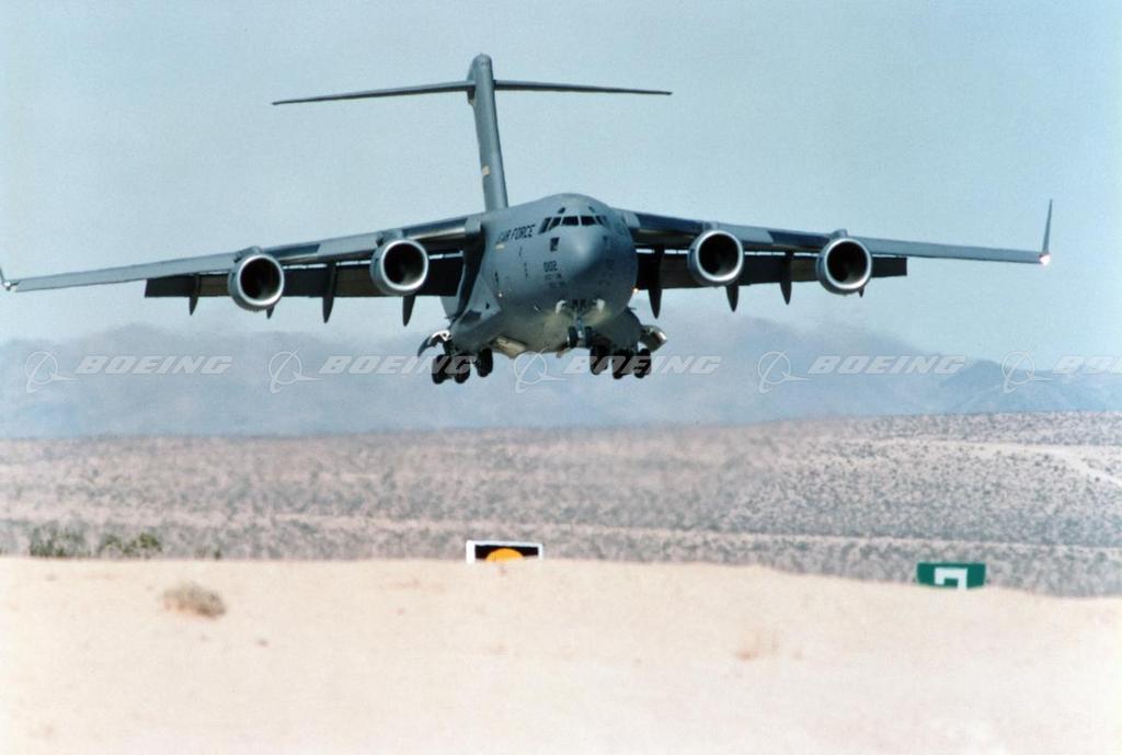 A C-17 Globemaster III comes in for a landing on a steel-matted runway at the U.S. Marine Corps desert warfare training center at 29 Palms, California. the C-17 is capable of routine operations into short, austere, semi-prepared runways and landing in under 3,000 feet.