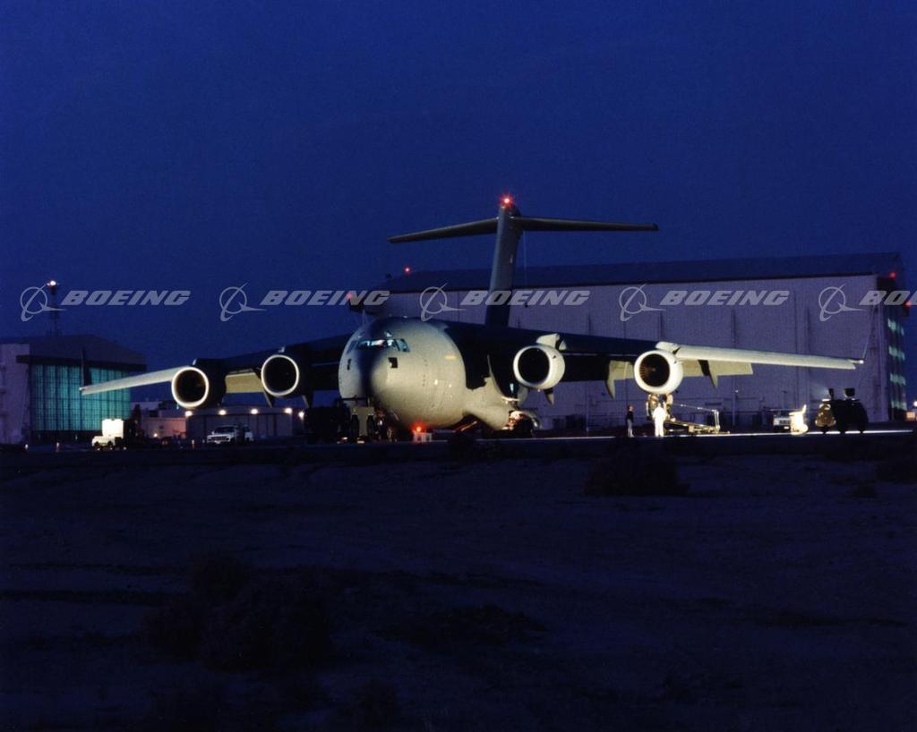 READY FOR NIGHT FLIGHT, U.S. Air Force/McDonnell Douglas C-17 Globemaster II transport is prepared for night flying mission at Edwards Air Force Base, CA.