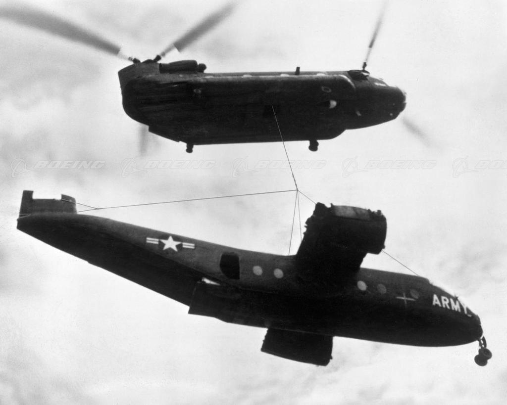 A downed two engine CV-2 Caribou aircraft, one of the largest loads ever carried by the U.S. Army's CH-47A Chinook helicopter at the time, is shown being returned 185 miles to a repair base in Vietnam in 1965. The wings, engines, and parts of the tail section were carried inside two other Chinook helicopters made by the Vertol Division of The Boeing Company. Chinook helicopters recovered millions of dollars worth of aircraft downed in action.