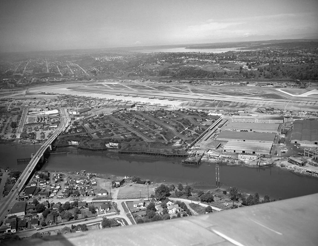 During WWII, a 26-acre make-believe village was constructed on top of Boeing's Plant II in Seattle to provide a wartime cover for the facility. This camouflage scheme for the plant also extended out over neighboring Boeing Field. Continuing the residential-suburb pattern of the factory roof, Boeing Field's camouflage outlined a more sparsely settled community. The roads - dark strips of oil-soaked earth - extended across the airstrips and up the side of Beacon Hill. The "houses" were painted slabs of concrete, about six inches high. Real grass helped to complete the residential effect. The make-believe roads on the side of the hill were simply swaths cut through low brush. Around Boeing Field, vegetable gardens were burlap-garnished wire on stone facings and the use of infra-red paint gave trees an evergreen appearance.