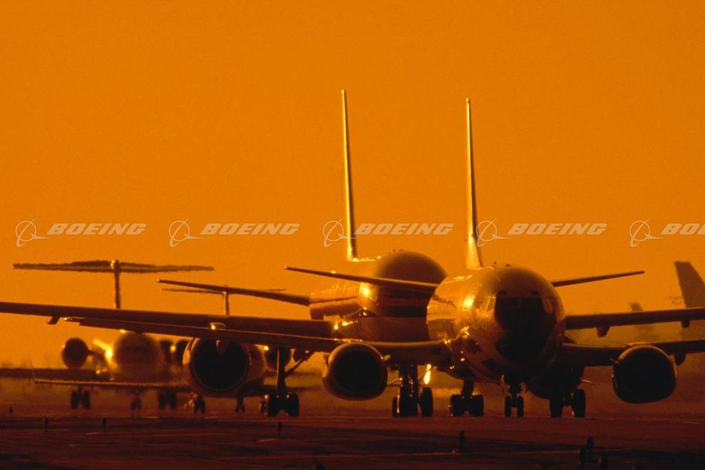 For decades, passengers around the world have relied on jetliners built by Boeing and McDonnell Douglas. Runway sunset stacked for take-off waiting take-off