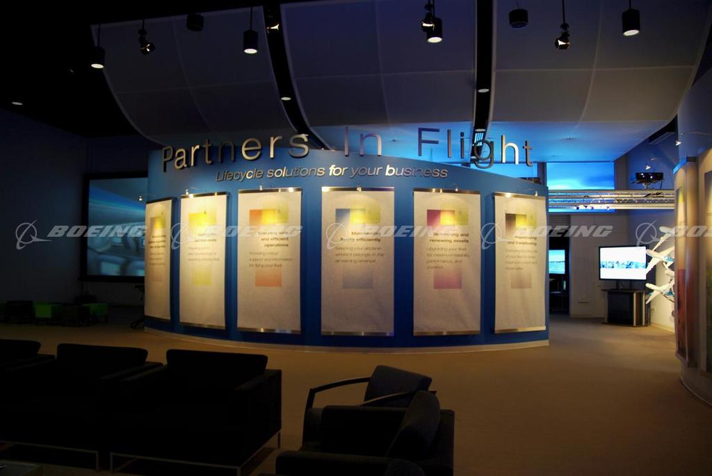 Displays at Boeing's Customer Experience Center in Renton, Washington feature interiors of the Boeing 787, 777 and 737 airplanes, as well as a 747-8 passenger mockup. Additional product features include the premium ceiling and signature seat interiors from the 777-200LR's "Going the Distance" world tour in 2005 and a 777 overhead crew rest display.