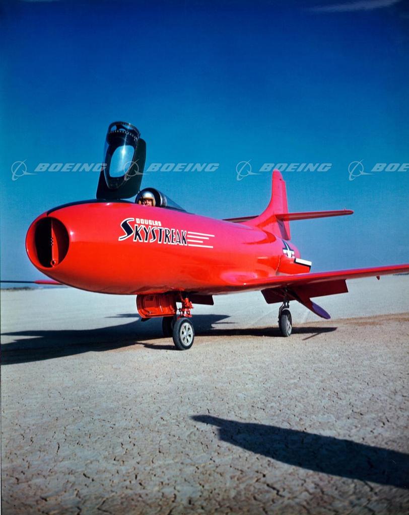 On August 25, 1947, with World War II Marine Corps ace Marion Carl at the controls, the Douglas D-558-1 Skystreak research aircraft took the official world speed record at 650.7 mph. Carl flew the Skystreak, painted a brilliant red and nicknamed the "Crimson Test Tube," at 1,310 feet over a 3-kilometer, closed-circuit course at Roger’s Dry Lake near Muroc, California. The Skystreak was built for the U.S. Navy to explore the problems faced by aircraft flying in the transonic region approaching the speed of sound.