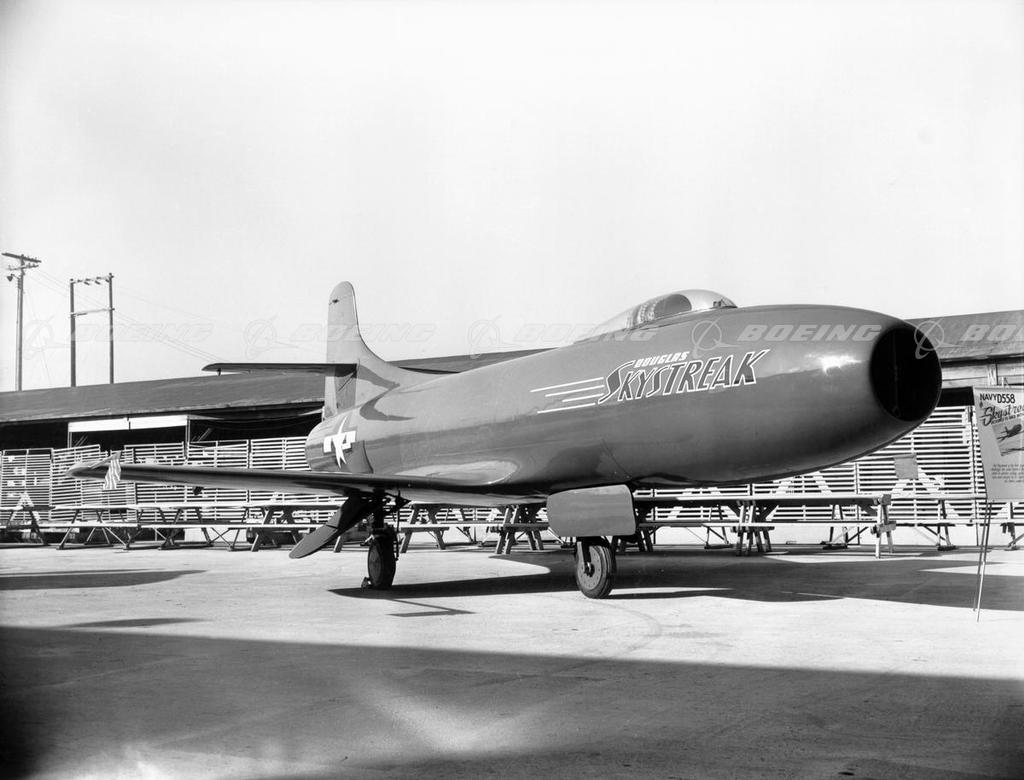 On August 25, 1947, with World War II Marine Corps ace Marion Carl at the controls, the Douglas D-558-1 Skystreak research aircraft took the official world speed record at 650.7 mph. Carl flew the Skystreak, painted a brilliant red and nicknamed the "Crimson Test Tube," at 1,310 feet over a 3-kilometer, closed-circuit course at Roger’s Dry Lake near Muroc, California. The Skystreak was built for the U.S. Navy to explore the problems faced by aircraft flying in the transonic region approaching the speed of sound.
