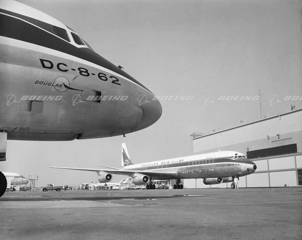 Douglas DC-8 (1958-1972): The Boeing 367-80 prototype jet transport had already made its first flight before Douglas decided to proceed with a jetliner of its own. The DC-8 was the first jet in the DC series and the first Douglas airliner to be completely built at the company’s plant in Long Beach, Ca. Powered by four turbofan jet engines and capable of speeds nearly 600 miles per hour, the DC-8 made its first flight on May 30, 1958. During a 14-year production run, the DC-8 went through seven major variants for a total of 556 aircraft. The plane set world records for speed, cargo capacity and range. During a test dive in 1962, a DC-8 Series 53 became the first commercial airliner to exceed the speed of sound. With a maximum capacity of 259 passengers, the DC-8 Super 63 was the largest commercial jet flying until the Boeing 747 entered service in 1970.