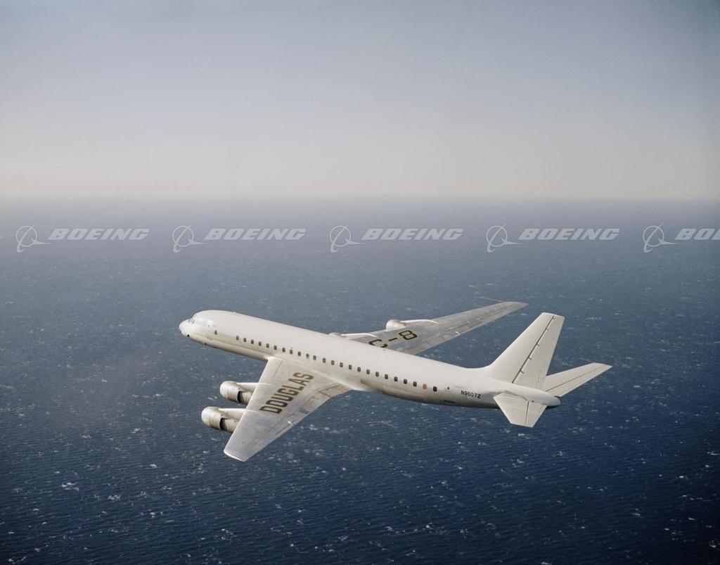 Douglas DC-8 (1958-1972): The Boeing 367-80 prototype jet transport had already made its first flight before Douglas decided to proceed with a jetliner of its own. The DC-8 was the first jet in the DC series and the first Douglas airliner to be completely built at the company’s plant in Long Beach, Ca. Powered by four turbofan jet engines and capable of speeds nearly 600 miles per hour, the DC-8 made its first flight on May 30, 1958. During a 14-year production run, the DC-8 went through seven major variants for a total of 556 aircraft. The plane set world records for speed, cargo capacity and range. During a test dive in 1962, a DC-8 Series 53 became the first commercial airliner to exceed the speed of sound. With a maximum capacity of 259 passengers, the DC-8 Super 63 was the largest commercial jet flying until the Boeing 747 entered service in 1970.