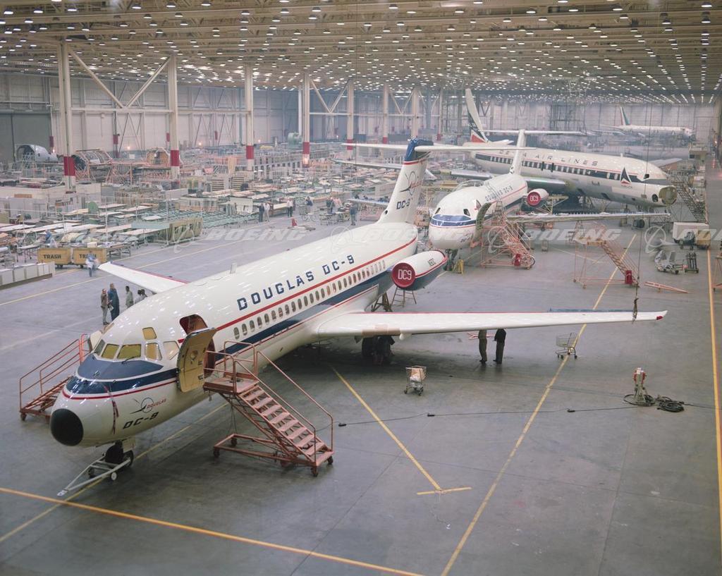 Douglas DC-9 (1965-1982): The DC-9 jetliner was designed to serve smaller airports and shorter routes than those served by the larger Boeing 727. It was developed to be a jet-age DC-3, bringing reliable jet service to any airport in the world. Smaller than the DC-8, the baseline DC-9 carried fewer passengers than some versions of the propeller driven DC-6 and DC-7 airliners. The DC-9 made its first flight on February 25, 1965, and entered service with Delta Airlines just 10 months later. It quickly became one of the most popular airlines ever built. In addition, the U.S. military ordered specially modified versions of the DC-9. The C-9A Nightingale was used by the Air Force to transport sick and injured military personnel. The Navy and Marine Corps flew the C-9B Skytrain II. Three executive transport versions were delivered to the Air Force as the VC-9C. With 976 aircraft produced in eight variations, the DC-9 ended its 17 year production run in 1982. Today, more than 800 DC-9s are still flying.