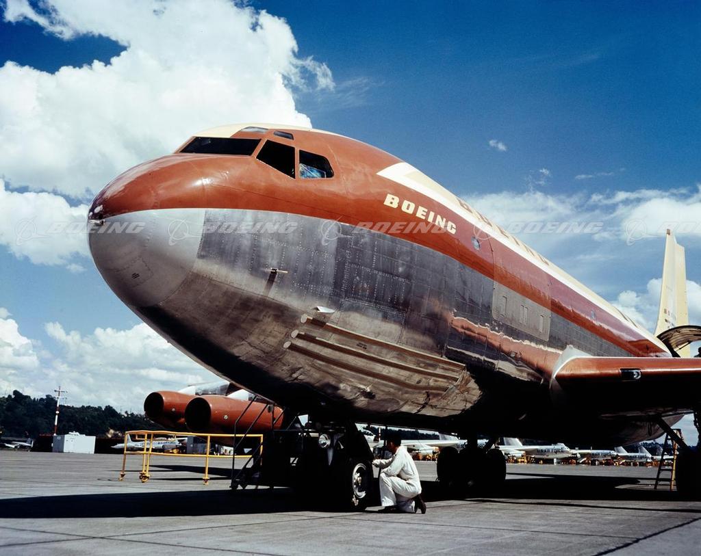 Mrs. William Boeing Christens the Boeing Dash 80 Prototype