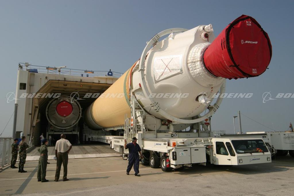 A Boeing Delta IV Heavy rocket, slated to fly its first operational payload in Fall of 2005, arrives at Cape Canveral, Florida on a massive Delta Mariner ship following a 1,400 mile trip from its Decatur, Alabama manufacturing facility. Each of the three Common Booster Cores (CBCs) that make up the vehicle measure 150 feet long. This marks the first time a full, three CBC Delta IV Heavy configuration has been transported by the Mariner to Cape Canaveral.
