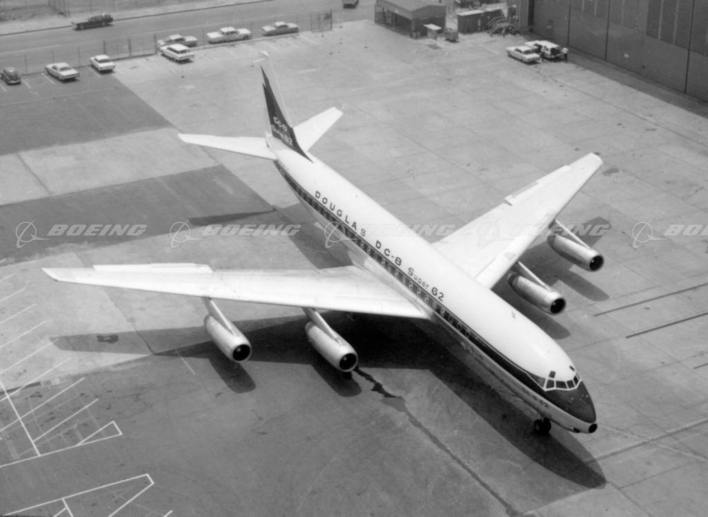 The DC-8 was the first Douglas jet-powered transport. Powered by four jet turbine engines, the DC-8 was capable of speeds of more than 600 mph. In a test dive, it became the first commercial transport of any kind to break the sound barrier. Throughout its 14-year-long production run, the DC-8 went through seven major variants, for a total of 556 aircraft. The DC-8 Series 60 extended the length of the fuselage. Nearly 37 feet longer than the original model, in an all-economy passenger configuration, the DC-8-61 could carry 260 people; its convertible-freighter configuration had a cargo volume of 12,535 cubic feet. The DC-8-62 shown here, for extra-long routes, had a fuselage stretched another 6 feet 8 inches and 3-foot wingtip extensions.