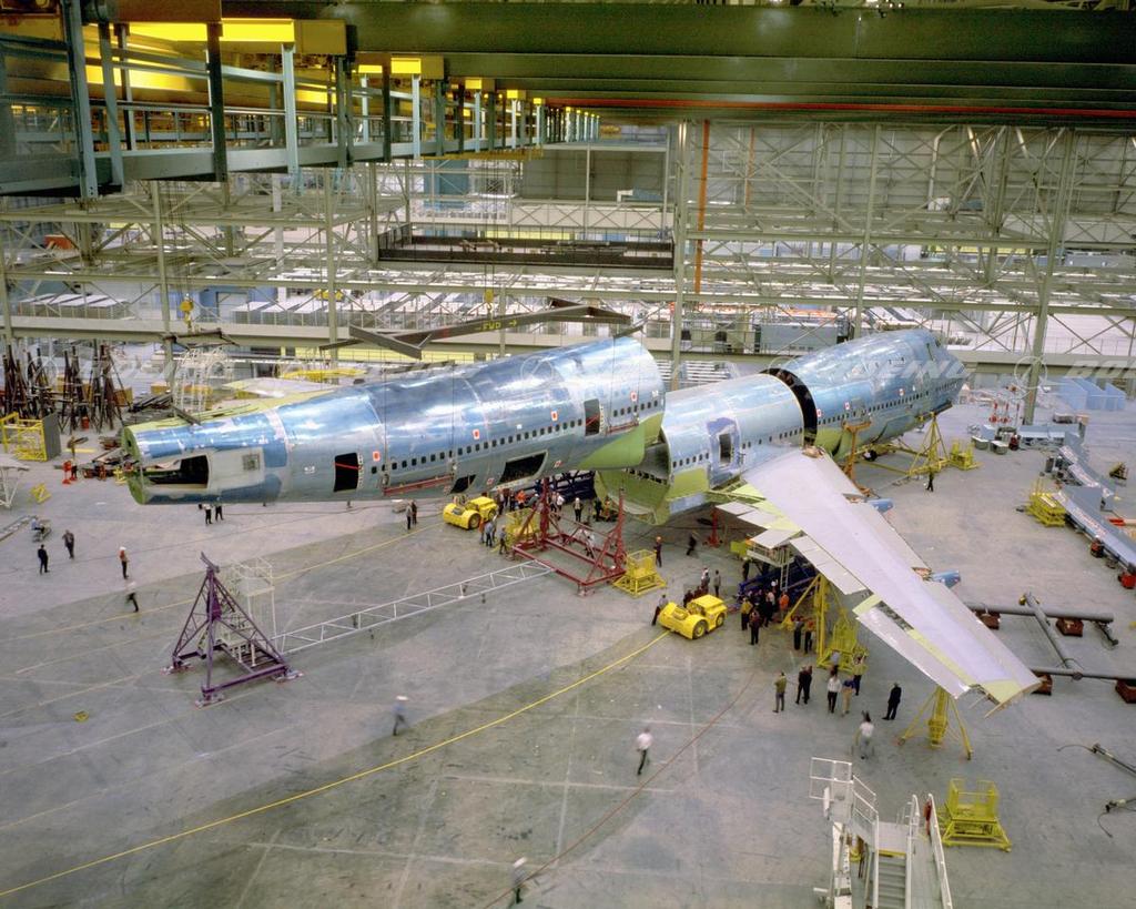 Production of the first 747s began as final phases of the Everett factory building project were completed.
