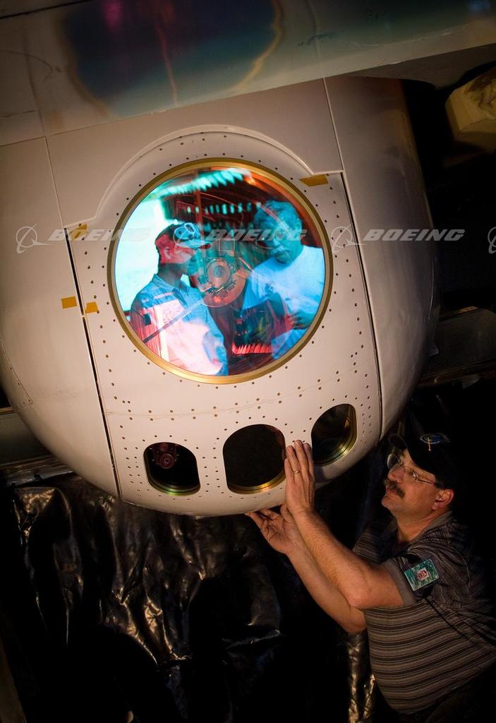 Boeing SVS Technicians Reflected in the Turret of the Advanced Tactical Laser (ATL)