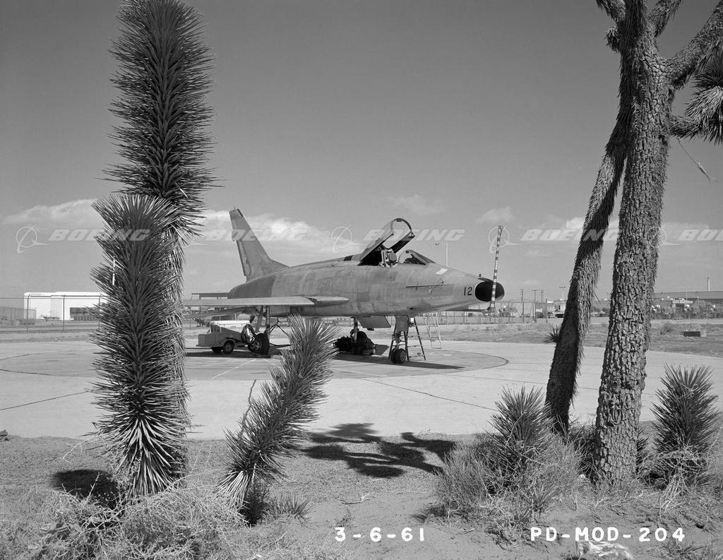 The F-100 Super Sabre was a sleek, swept-back-wing fighter that gave the United States a supersonic Air Force. Since May 1953, when the first prototype model, the YF-100, bettered the speed of sound on its first flight, the versatile fighter set numerous records for speed, endurance, range and maintenance. Late production models of the F-100D and F-100F had the capability of being launched from remote areas in the manner of manned missiles. Of the 2,290 Super Sabres produced, 1,274 F-100Ds included the first autopilot designed for a supersonic jet. Powered by a 16,950-pound-thrust afterburning jet engine, the F-100 was armed with four 20-millimeter cannons, two GAM 83A Bulldog missiles, four Sidewinder missiles, rockets, special stores, and/or 7,040 pounds of bombs.To demonstrate the ability of its pilot and aircraft, the Air Force chose F-100 Super Sabres to perform throughout the world in aerial precision demonstration flights. The famed Thunderbirds, a four-man aircraft team, were viewed by over 19 million people as the storied pilots performed intricate precision maneuvers at low altitude.