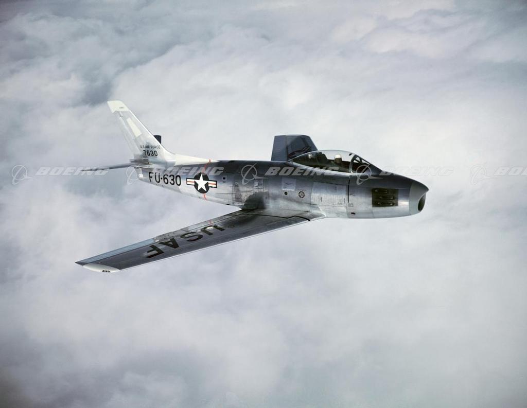 The North American F-86 Sabre Jet made its first flight Oct. 1, 1947, and was America’s first single-seat, swept-wing jet fighter. In 1948, it set a new world speed record of 671 mph, and it was the world’s first-line fighter for more than a decade after it was designed. More than 6,000 Sabre Jets were built worldwide. During the Korean conflict, the Sabre Jet flew 82,177 sorties during 32 months of combat and troop support. Four models of the craft (F-86A, E, F and H) were day fighters or fighter bombers, while the F-86D, K and L versions were all-weather interceptors and sported black radome noses, replacing the yawning jet intakes of the other models. The version built for the U.S. Navy and Marine Corps was called the FJ-2 Fury.