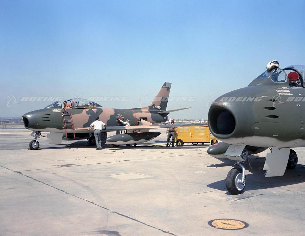 The North American F-86 Sabre Jet made its first flight Oct. 1, 1947, and was America’s first single-seat, swept-wing jet fighter. In 1948, it set a new world speed record of 671 mph, and it was the world’s first-line fighter for more than a decade after it was designed. More than 6,000 Sabre Jets were built worldwide. During the Korean conflict, the Sabre Jet flew 82,177 sorties during 32 months of combat and troop support. The version built for the U.S. Navy and Marine Corps was called the FJ-2 Fury.