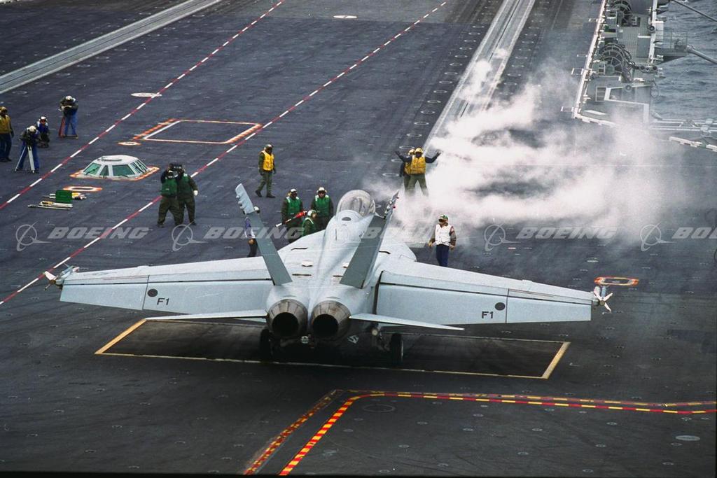 A U.S. Navy F/A-18E/F Super Hornet made its first carrier launch and landing aboard the USS John C. Stennis on Jan. 18, 1997. U.S. Navy test pilot Lt. Frank Morley was at the controls of the two-seat F/A-18F-1. The takeoff and landing were part of a two-week period of initial sea trials to test the Super Hornet's ability to operate from the deck of a carrier.