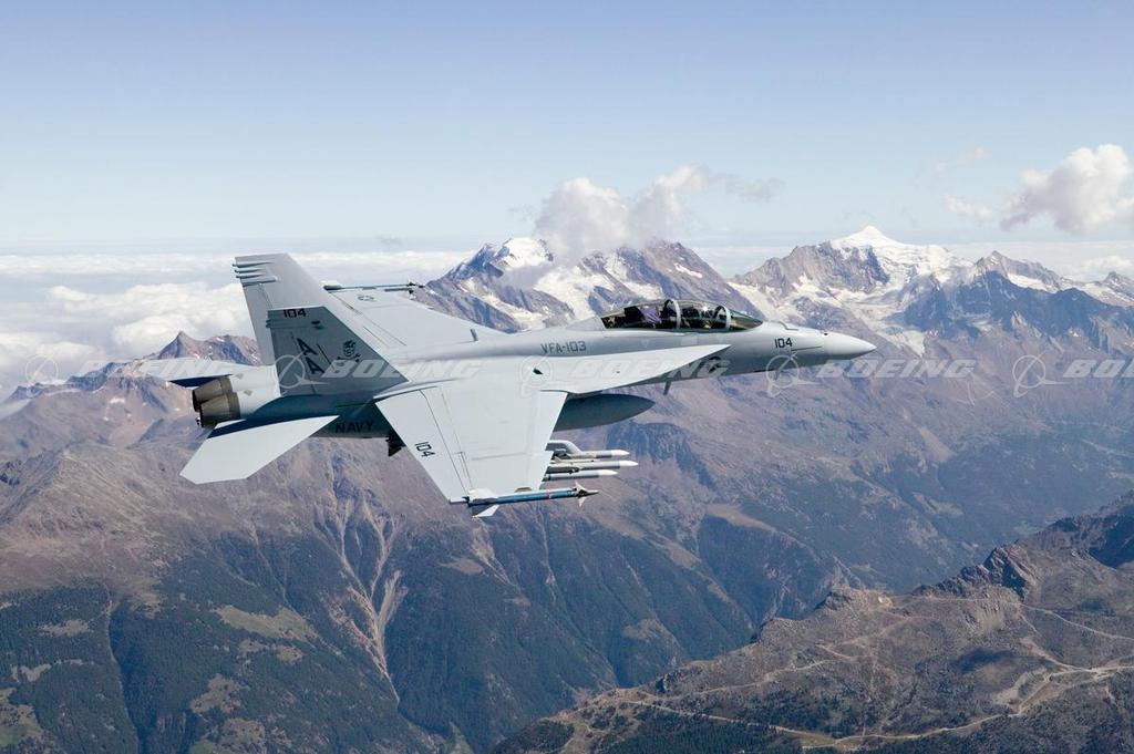 F/A-18E/F Super Hornet in Flight over Swiss Alps