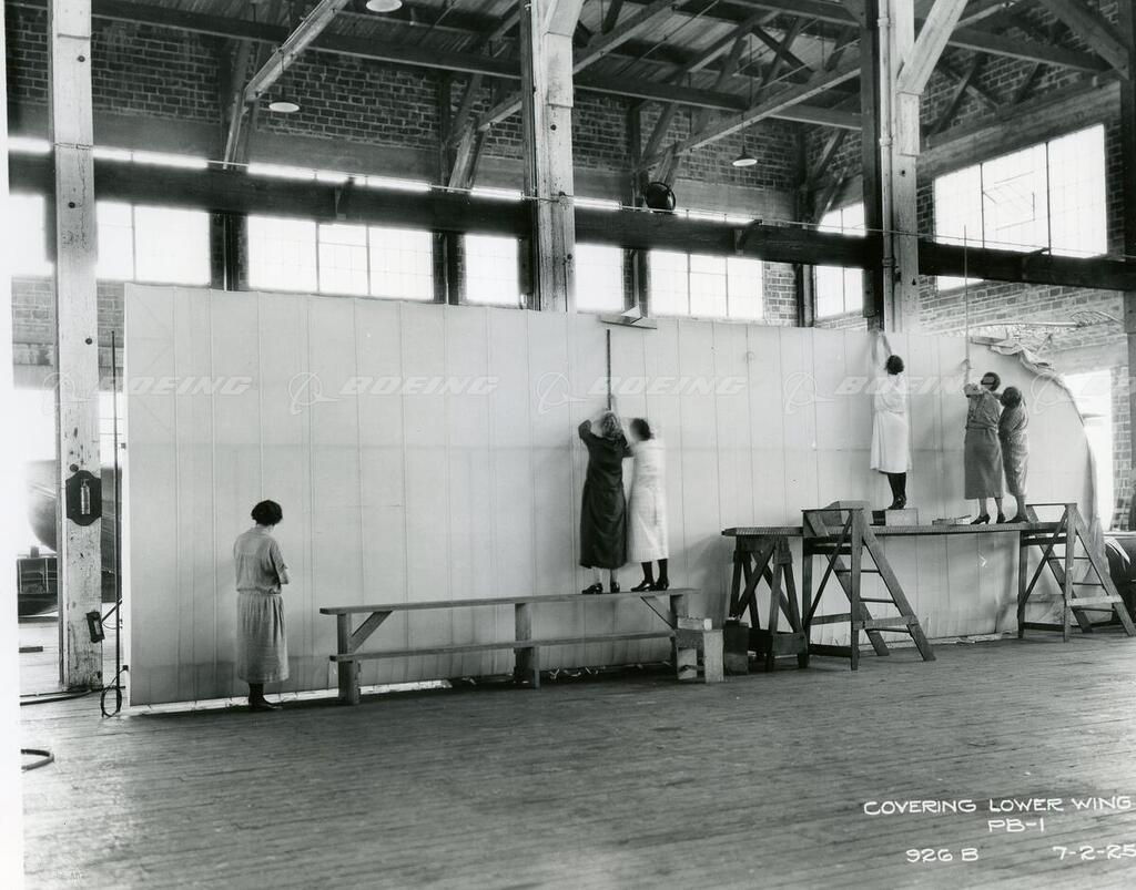 Female employees covering lower wing of a PB-1 in 1925.