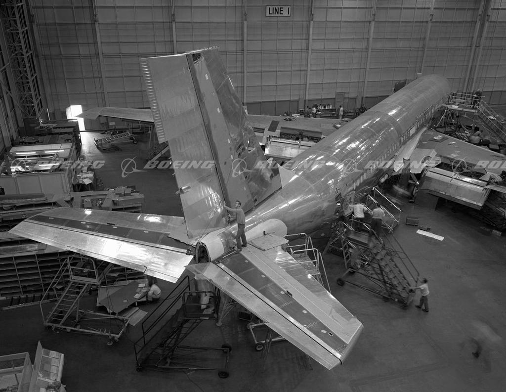 After the Air Force agreed to let Boeing build commercial jets based on the prototype 367-80, already the basis for the KC-135 military tanker, airlines began to order the 707, the commercial transport variant of the Dash 80. The 707 and the KC-135 had many features in common. Both were visually distinct, with a stinger antenna pointing forward from the top of their vertical fin. The 707's width and 100-foot length made it the largest passenger cabin in the air at the time. Placement of its more than 100 windows allowed airlines to rearrange seats. Location of passenger doors on the left side, at the front and at the rear of the cabin, became standard for subsequent Boeing jets. The exteriors of the 707 and its competitor, the DC-8, were almost identical, but the 707 wing had more sweepback, so it could fly about 20 mph faster.