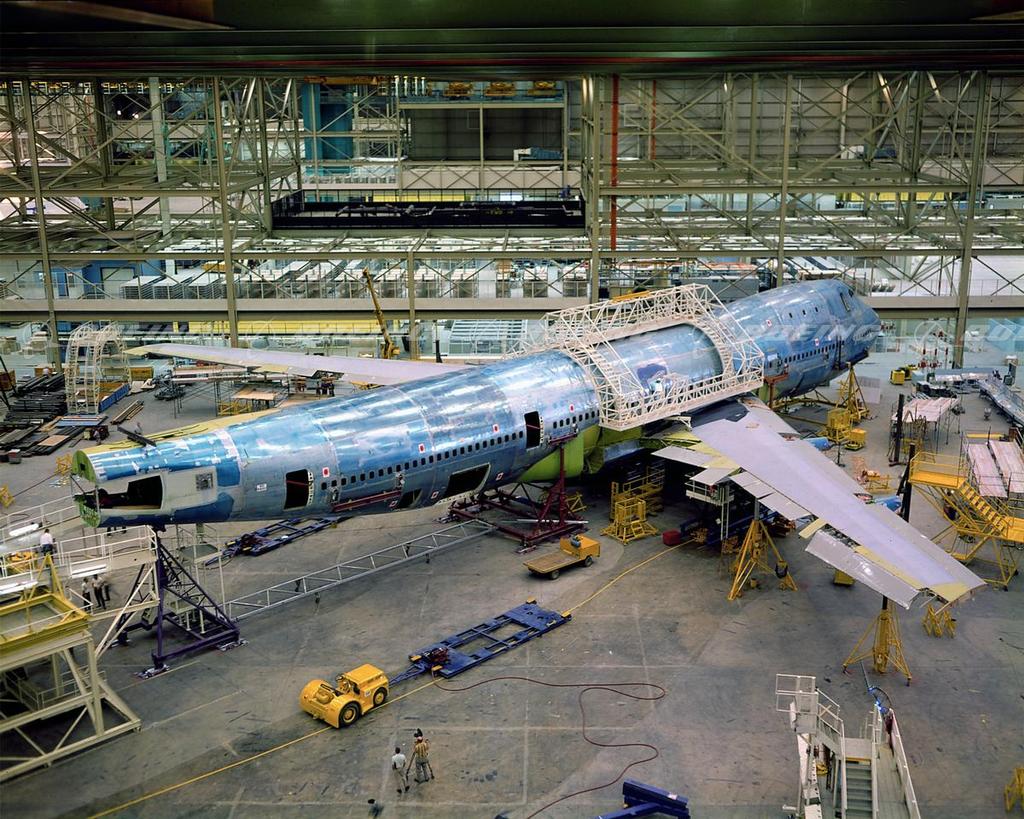 The 747 was truly monumental in size. The massive airplane required construction of the 200-million-cubic-foot 747 assembly plant in Everett, WA., the world's largest building (by volume). The fuselage of the original 747 was 225 feet long; the tail as tall as a six-story building. Pressurized, it carried a ton of air. The cargo hold had room for 3,400 pieces of baggage and could be unloaded in seven minutes. The total wing area was larger than a basketball court. Yet, the entire global navigation system weighed less than a modern laptop computer.