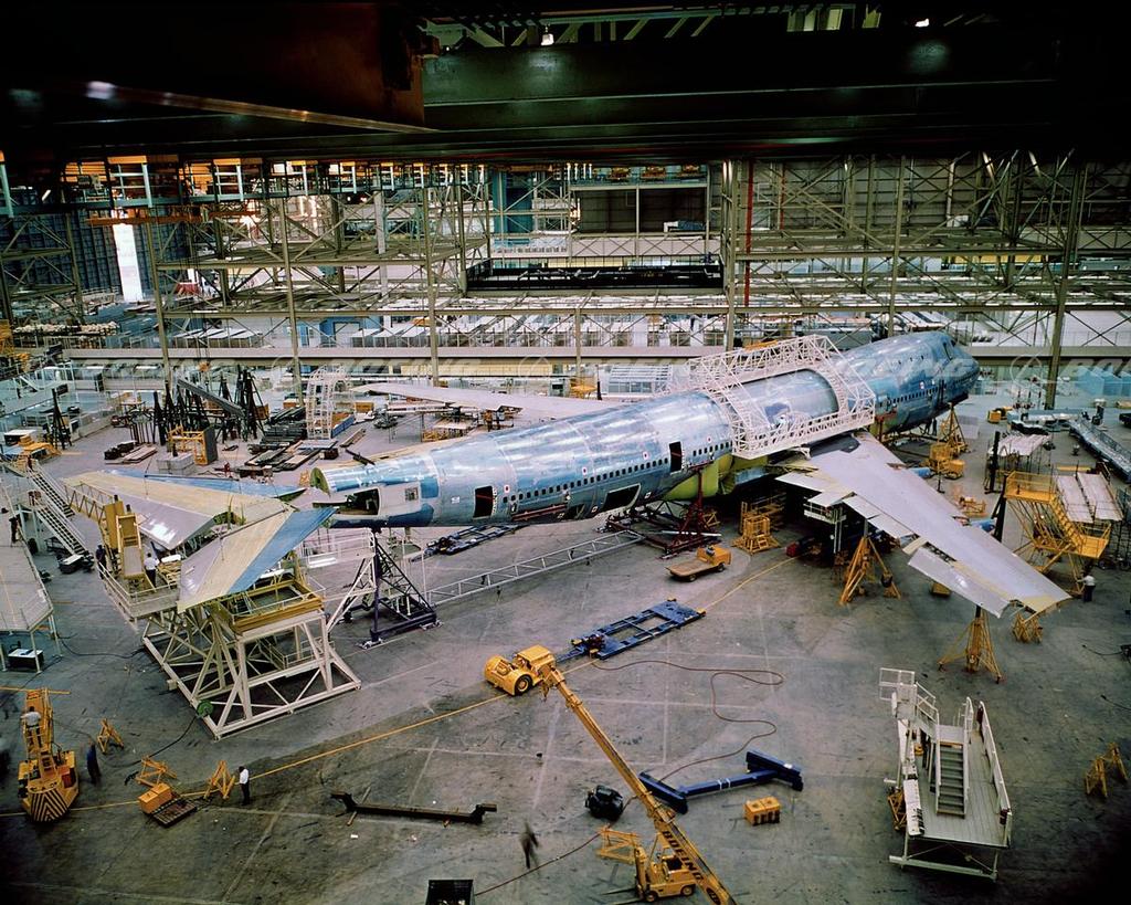 The 747 was truly monumental in size. The massive airplane required construction of the 200-million-cubic-foot 747 assembly plant in Everett, WA., the world's largest building (by volume). The fuselage of the original 747 was 225 feet long; the tail as tall as a six-story building. Pressurized, it carried a ton of air. The cargo hold had room for 3,400 pieces of baggage and could be unloaded in seven minutes. The total wing area was larger than a basketball court. Yet, the entire global navigation system weighed less than a modern laptop computer.