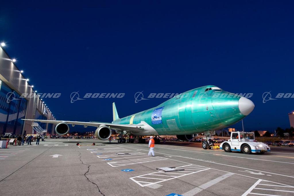 On Nov. 12, 2009, Boeing towed the first 747-8 Freighter out of the factory in Everett, Washington. The airplane was to be painted and began preparations for flight test.