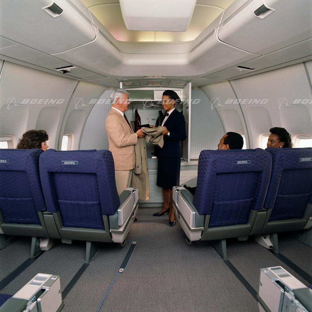 A flight attendant assists a passenger with his coat on the lower deck passenger cabin of the 747.
