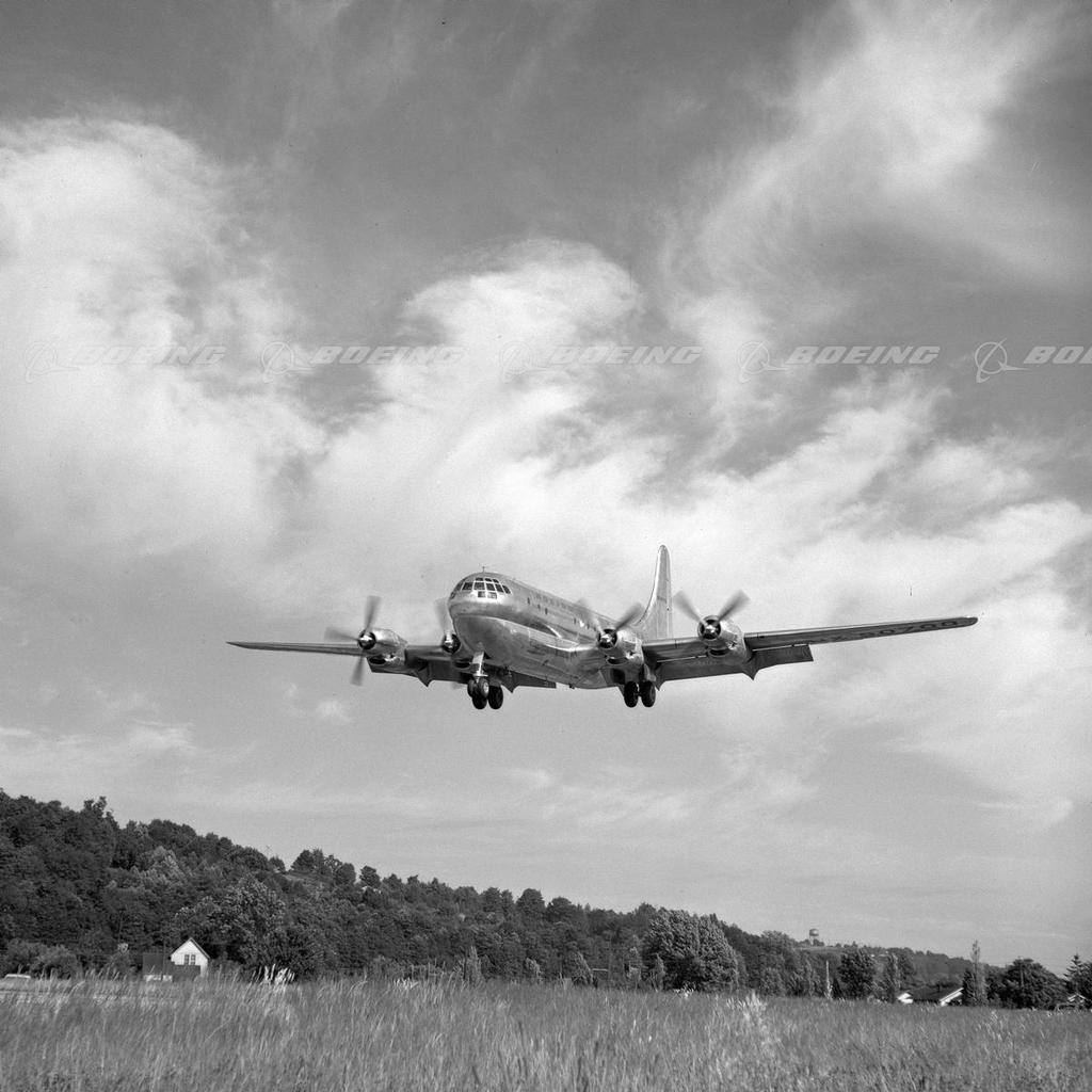 The 377 Stratocruiser was the last of the Boeing propeller-powered luxury airliners. Known as the First Lady of the Airways, it first flew in 1947 as the elegant, civilian offspring of the C-97, a military freighter that carried soldiers and equipment during World War II. A circular stairway led from the cabin to a lower deck luxury lounge. As a sleeper, it held 28 upper- and lower-bunk units. The first Stratocruiser began service in 1949 between San Francisco to Honolulu. Only five years later, the Boeing Dash 80 prototype for the Model 707 made its first flight, and the Stratocruiser became obsolete. It found a new career as special transport for large sections of spacecraft. With its fuselage swollen by a superstructure, the once-elegant Stratocruiser became known as the Pregnant Guppy and, even larger, as the Super Guppy.