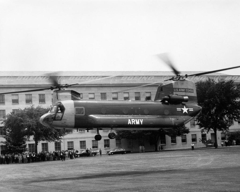 August 9, 1962. The United States Army has received delivery of its first HC-1B Chinook helicopter. This twin-turbine aircraft, one of a quantity on order at The Boeing Company's Vertol Division, was delivered to the Army Aviation Board at Fort Rucker, Alabama. Enroute to Alabama, the Chinook stopped at the Pentagon Heliport (above) for static display and flight demonstration. Stops were also made at Fort Belvoir, Fort Eustis, Fort Bragg and Fort Benning. The HC-1B Chinook is being procured by the U.S. Army through the U.S. Air Force Aeronautical Systems Division, Dayton, Ohio, and will replace present piston-driven helicopters. A number of the aircraft are presently undergoing flight testing at the Vertol Division's Flight Test Center, Philadelphia International Airport. A static testing program is underway at Wright-Patterson Air Force Base along with cold weather environmental testing at Eglin Air Force Base. From: Public Relations, Vertol Division/Boeing, Morton, PA.