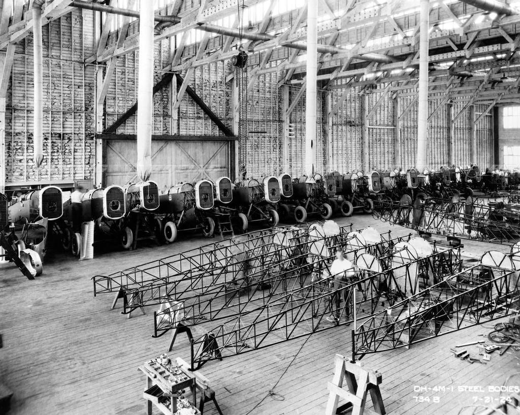 Boeing gained valuable early experience in metal structures in 1924 by rebuilding surplus de Havilland DH-4s, replacing their wire-braced wooden fuselages with welded steel tubing. historic fabrication shop floor