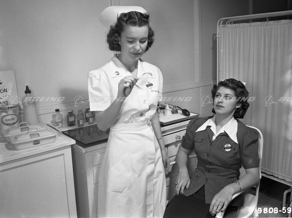 Industrial nurse at work in a dispensary. North American Aviation LA 1943.