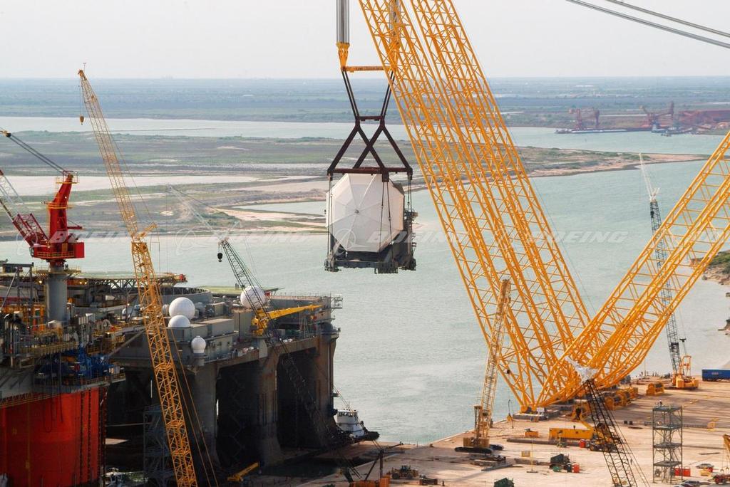 The Sea-Based X-Band Radar (SBX), a key component of the U.S. Missile Defense Agency's Ground-based Midcourse Defense Program is lifted and then integrated onto its sea-going platform in Corpus Christi, Texas, marking a major integration milestone in the program.