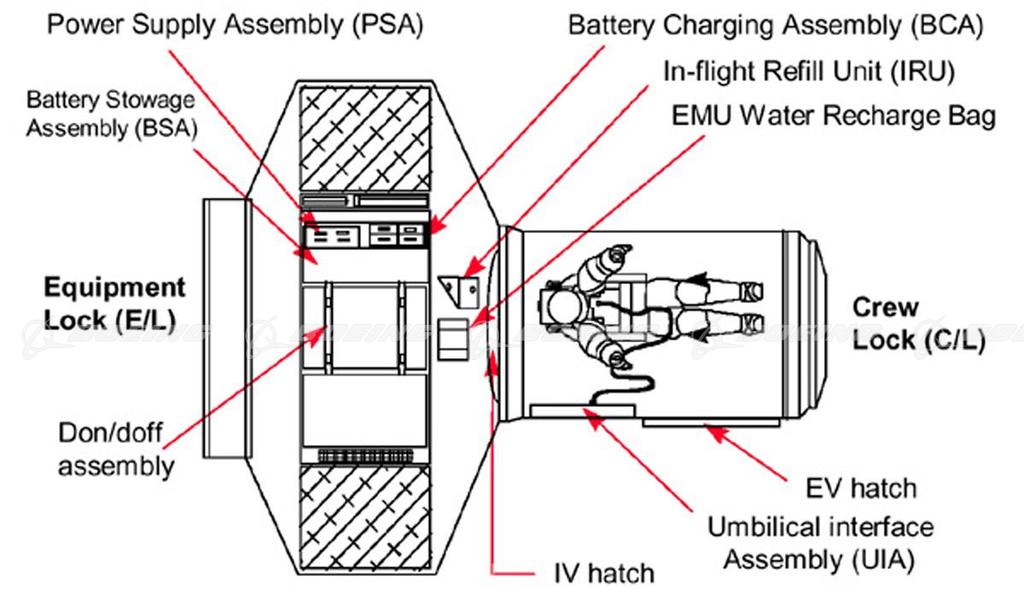 This cutaway diagram of the Airlock for the International Space Station shows the key elements for this gateway to space. Included is the Equipment Lock where the space suits are stored and the Crew Lock, from which the astronauts will exit and enter the International Space Station. Built by Boeing, the Airlock is made of aluminum. It is 18 feet long (5.5 meters), 13 feet in diameter (4) meters, and weighs 13,368 pounds (6,064 kilograms)