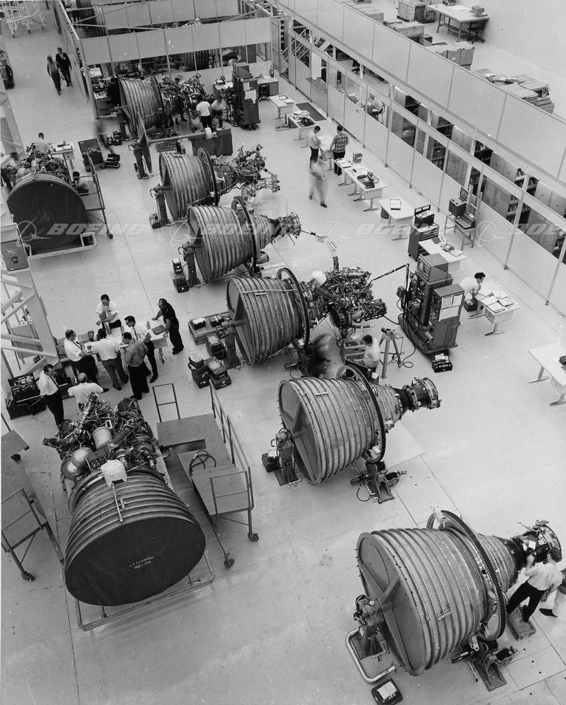 January 18, 1966 Press Release: This is the production line for thrust chambers of hydrogen-fueled J-2 rocket engine that will launch first orbital flights of three astronauts in Apollo spacecraft, later will fly the spacecraft on its journey to the moon. J-2 develops 200,000 pounds of thrust. It is being produced at Canoga, Calif. plant of Rocketdyne, a division of North American Aviation, Inc., for NASA's Marshall Space flight Center. A single J-2 will power the S-IVB stage being built by Douglas Aircraft Company for the second stage of the Saturn IB vehicle and the third stage of Saturn V. Five J-2's will be used to produce 1,000,000 pounds of thrust in the S-II stage being built by North American's Space and Information systems Division for the second stage of the Saturn V moon-launch vehicle.