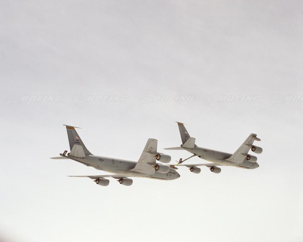 The KC-135 was the only jet airplane designed specifically for aerial refueling. More than 732 KC-135s were built, and most, with modifications, remain in service into the 21st century. The KC-135 shared the Dash-80 prototype with the Boeing 707 commercial transport, but was launched first in 1956. The KC-135's aerial refueling equipment in the lower deck leave the upper deck clear for 25 tons of cargo or 80 troops. KC-135s supplied warplanes with fuel during the Persian Gulf conflict, Operation Enduring Freedom over Afghanistan, and for homeland defense.