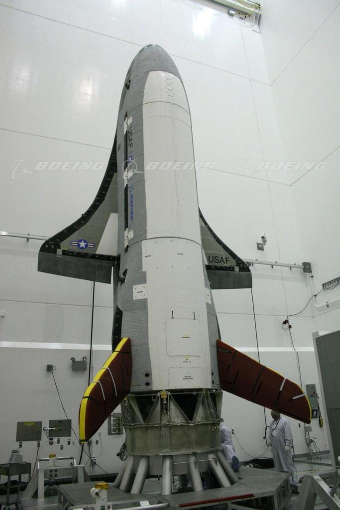 Weighing 11,000 pounds at launch and measuring 29 feet, 3 inches long with a wing span of 14 feet, 11 inches, the Boeing-built X-37B Orbital Test Vehicle is shown being processed for launch from Cape Canaveral Air Force Station. Built for the United States Air Force, the first flight will validate the technologies necessary for long-duration reusable space vehicles with autonomous re-entry and landing capabilities.