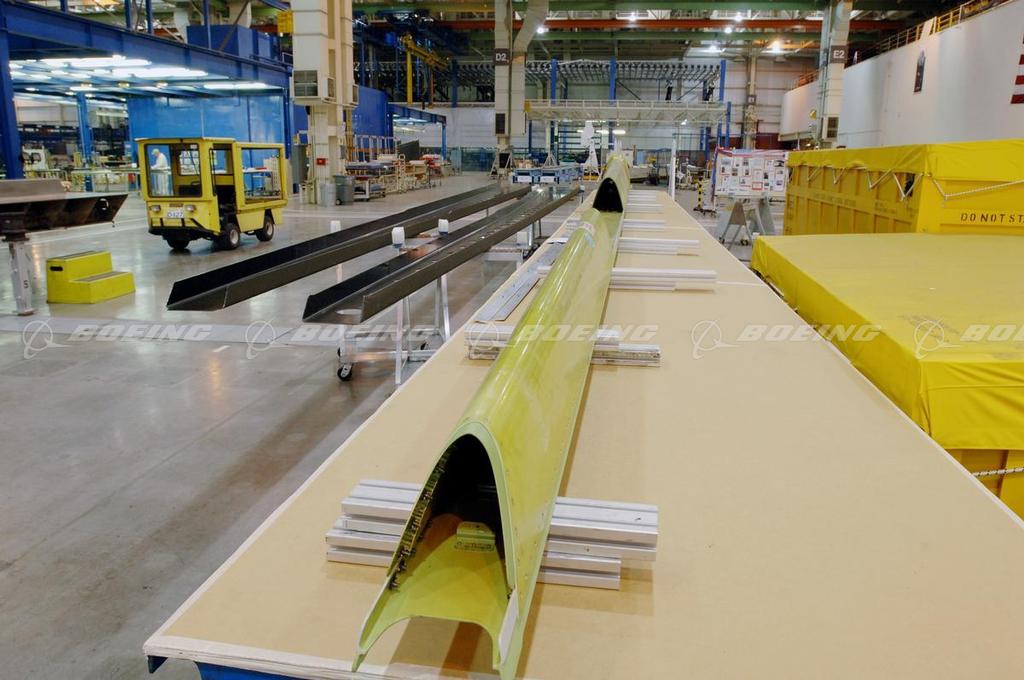 A leading edge part for a 777 vertical fin is prepared for final assembly at the Boeing composites manufacturing facility in Frederickson, Washington.
