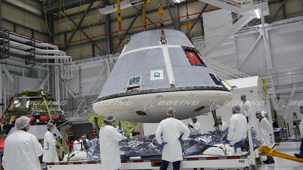 Boeing technicians install the back shells on the Orbital Flight Test-2 crew module